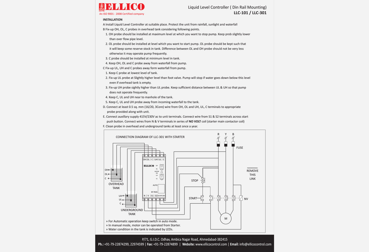 - Automatic Control of starter according to set water level in tanks
